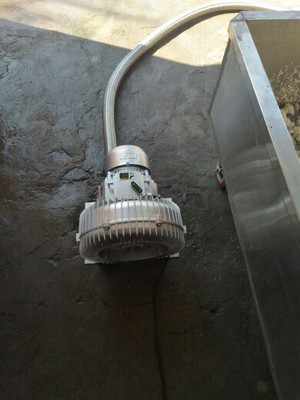 具體方法:此客戶是采用高壓鼓風機的的高壓吹力,通過管道把風量輸送至不銹鋼容器的底部,底部有很多的小氣孔,風量通過氣孔流出,加速容器里面的物流的快速降熱。